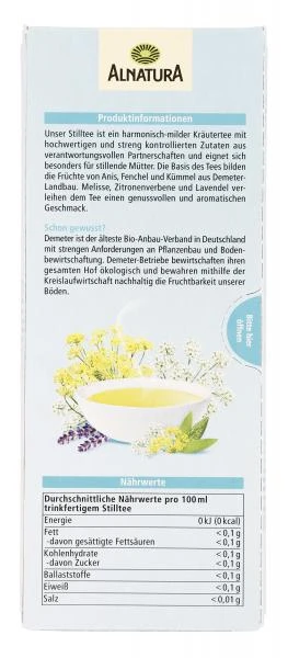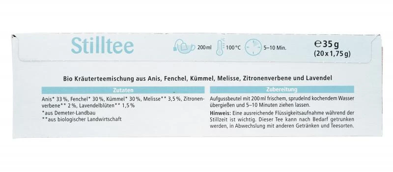 Ein harmonisch-milder Bio-Kräutertee, der sich besonders für stillende Mütter eignet. Mit Anis, Fenchel und Kümmel aus Demeter Bio-Landbau, Melisse, Zitronenverbene und Lavendel runden den Geschmack ab. 20 Aufgussbeutel pro Packung.