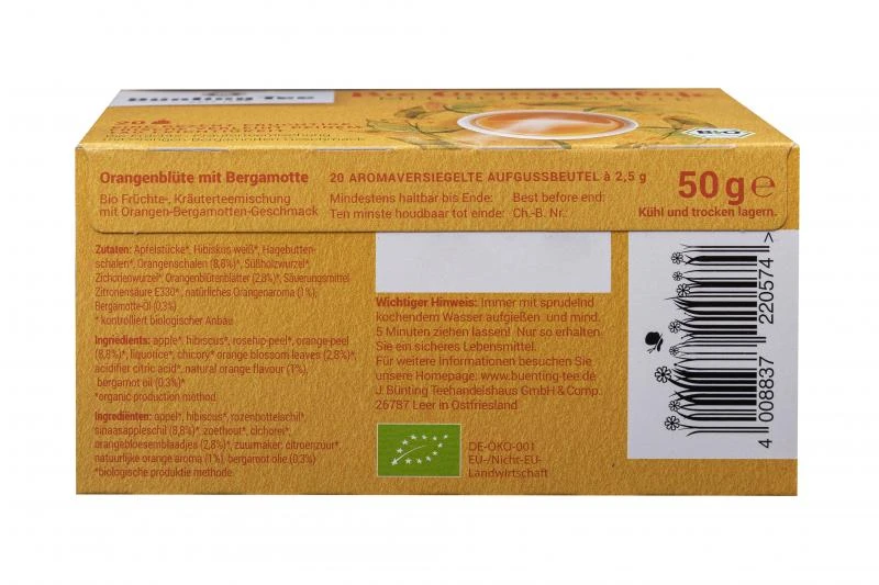 Lieblich frische Bio Früchte- und Kräuterteemischung mit Orangen-Bergamotten-Geschmack.Eine dezent fruchtige Frische verleiht Deinem Tag Leichtigkeit.