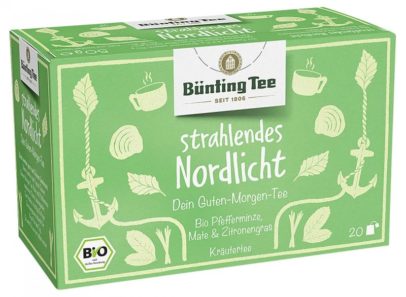 Strahlendes Nordlicht. Dein Guten-Morgen-Tee. Wach werden ganz nach Deinem Geschmack. Starte sanft in den Tag mit Deinem Guten-Morgen-Tee. Mate und Pfefferminze inspirieren Deine Lebensgeister. Der frische, fruchtige Duft des Zitronengrases schenkt Dir Kraft für den Tag. So wirst Du wie von selbst munter.