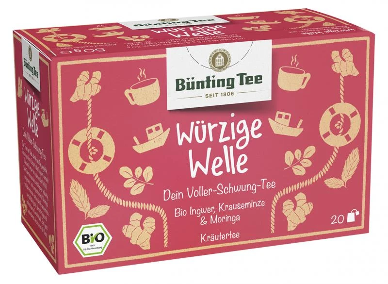 Würzige Welle. Dein Voller-Schwung-Tee. Der Tee, der Dich durch den Tag begleitet. Die angenehme Schärfe des Ingwers verleiht Deinem Körper ein wärmendes Gefühl. Seit Jahrtausenden wird Ingwer vielseitig eingesetzt. In Komposition mit Moringa und der intensiv duftenden Krauseminze vervielfältigt sich der würzige und erfrischende Geschmack. Ein ganz besonderes Aroma nur für Dich!