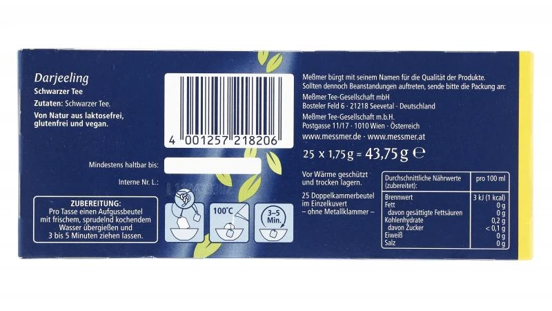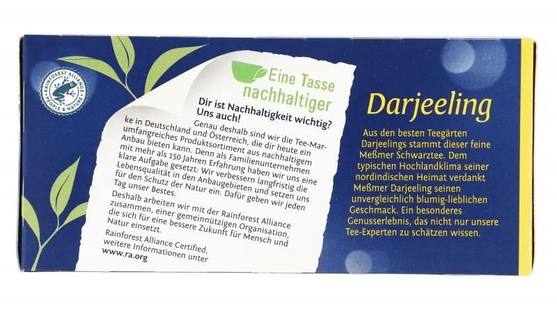 Aus den besten Teegärten Darjeelings stammt dieser feine Meßmer Schwarztee. Dem typischen Hochlandklima seiner nordindischen Heimat verdankt Meßmer Darjeeling seinen unvergleichlich blumig-lieblichen Geschmack. Ein besonderes Genusserlebnis, das nicht nur Meßmers Tee-Experten zu schätzen wissen.