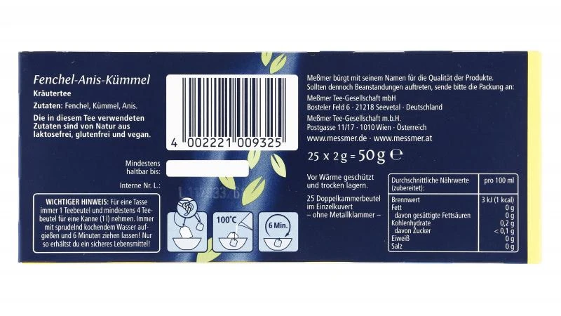 Diese Kräuterteemischung ist eine ideale Ergänzung zur Deckung des täglichen Flüssigkeitsbedarfs, auch während der Stillzeit. Die Tee-Experten wissen um diese positiven Eigenschaften und haben im Meßmer Fenchel-Anis-Kümmel-Tee die 3 Kräuter harmonisch miteinander vereint.