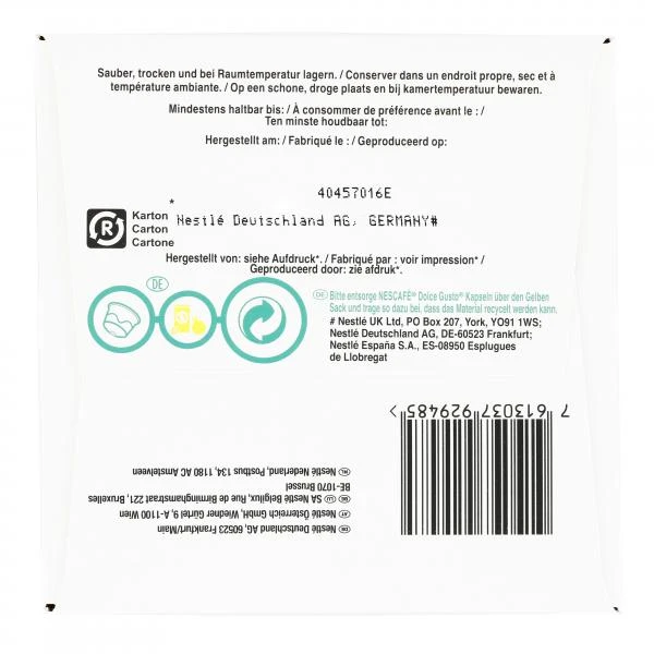 Schalten Sie die Nescafé Dolce Gusto Maschine ein. Einfach Kapsel in den Kapselhalter der Nescafé Dolce Gusto Maschine einlegen, Hebel herunter drücken und die Wasserzufuhr der Maschine starten. Bei den manuellen Modellen den Hebel für heiße Getränke nach rechts stellen. Wenn die gewünschte Wassermenge erreicht ist, den Hebel wieder zur Mitte stellen. Bei den automatischen Modellen stellen Sie mit Hilfe des Wählrads die gewünschte Wassermenge ein – (Sie finden auf jeder Kapsel eine Herstellerempfehlung – hier: 2 Striche). Zum Starten drücken Sie bei heißen Getränken den roten Knopf. Nachdem die Zubereitung abgeschlossen ist, warten Sie 3 Sekunden, bis das Licht an dem Ein-/Ausschalter wieder grün leuchtet. Jetzt können Sie den Hebel wieder nach oben drücken und Ihr fertiges Getränk genießen. Empfohlene Wassermenge: 50ml
