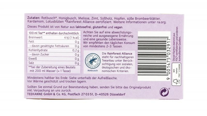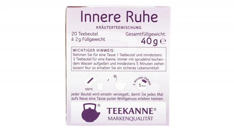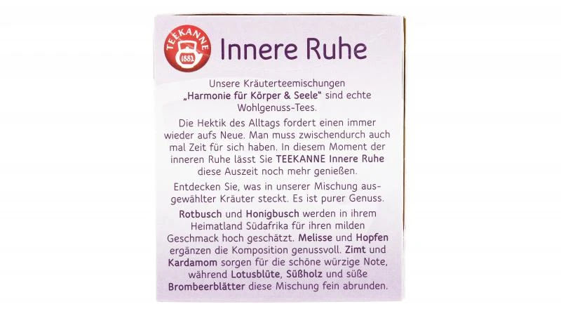 Tauche ein in Deinen persönlichen Moment der Harmonie mit Teekanne Innere Ruhe. Der fein abgestimmte Tee wird Dich garantiert begeistern: Milder Rotbusch und Honigbusch aus Südafrika vereinen sich mit einer erlesenen Auswahl. Zimt und Kardamom sorgen für die würzige Note. Lotusblüten, Süßholz und süße Brombeerblätter verleihen sanfte Süße. Melisse und Hopfen runden die Komposition genussvoll ab. Ein Erlebnis für Deine Sinne.