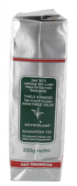 Echte ostfriesische Schwarztee-Mischung. Der meistgekaufte Thiele Tee – kräftig, aromatisch und sehr ergiebig. Beste Assam-Tees prägen den vollen, fein-herben Geschmack dieser klassischen Spitzenmischung: lecker und typisch ostfriesisch.